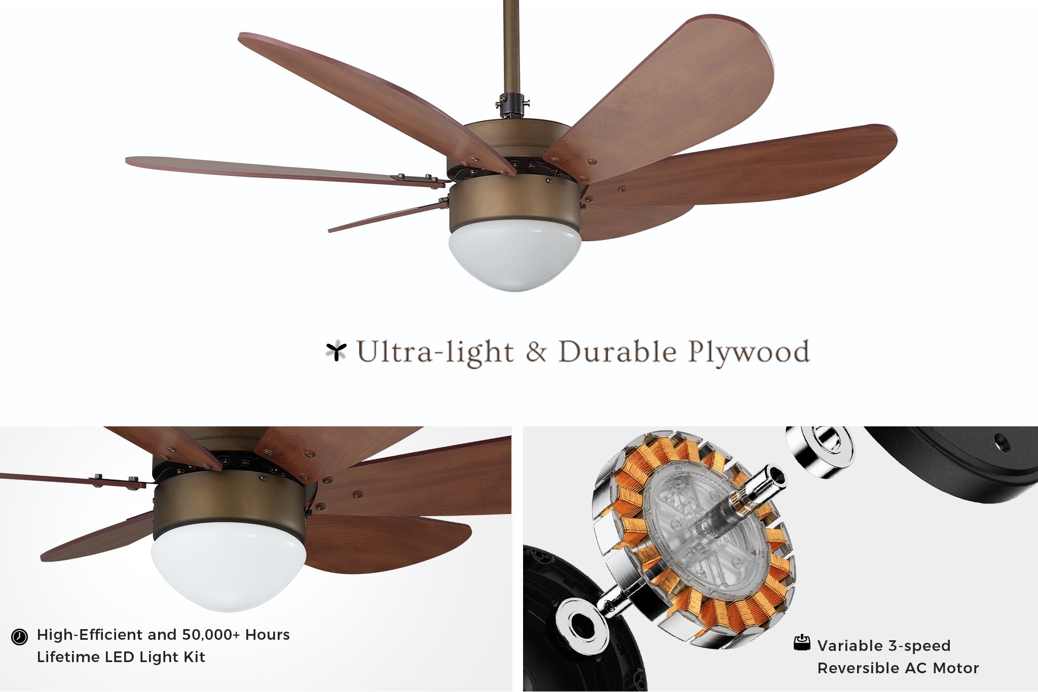 A 3-speed and reversible AC motor is integrated in this smart ceiling fan, which provides high-velocity airflow without any noise.