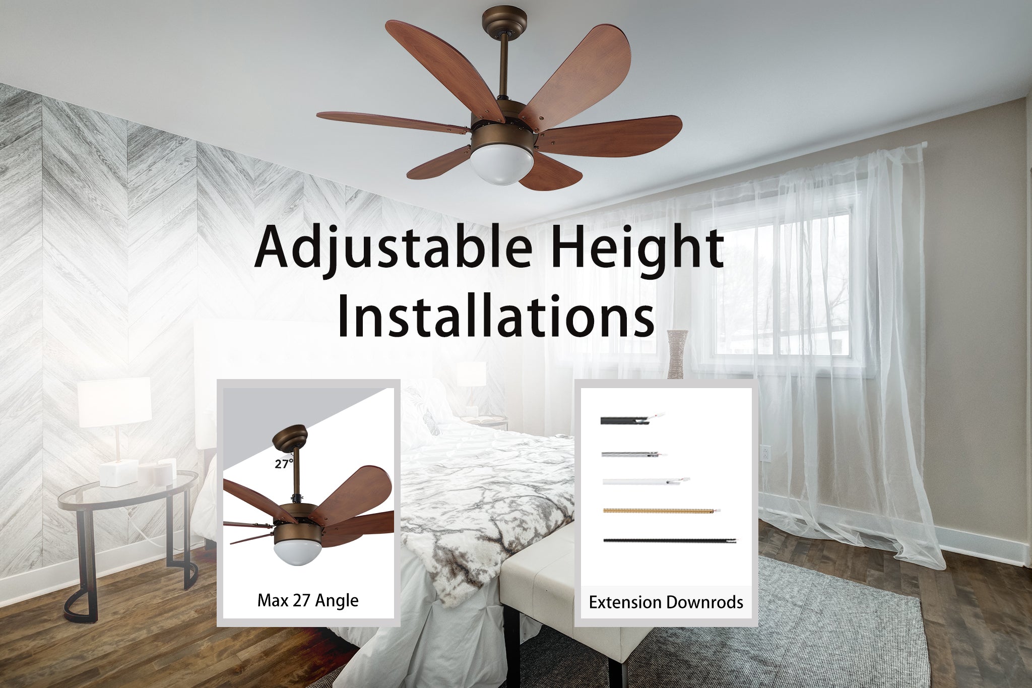 - ANGLED MOUNTING: Max 25°~27°angle,an extended downrod is required.