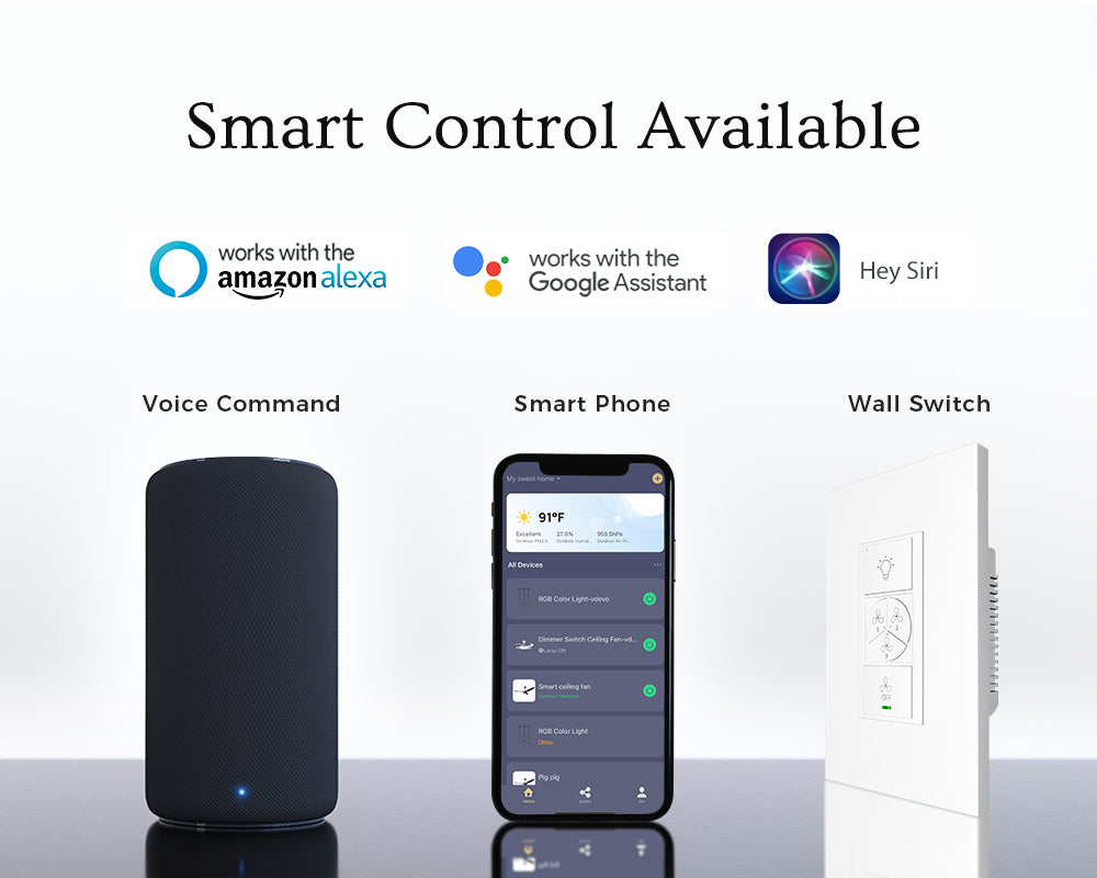 Full function with fan speed, light on/off, you can control your ceiling fan from anywhere with mobile app. Works with Alexa, Google Home Assistant. Just give a simple voice command to control your ceiling fans with lights.
