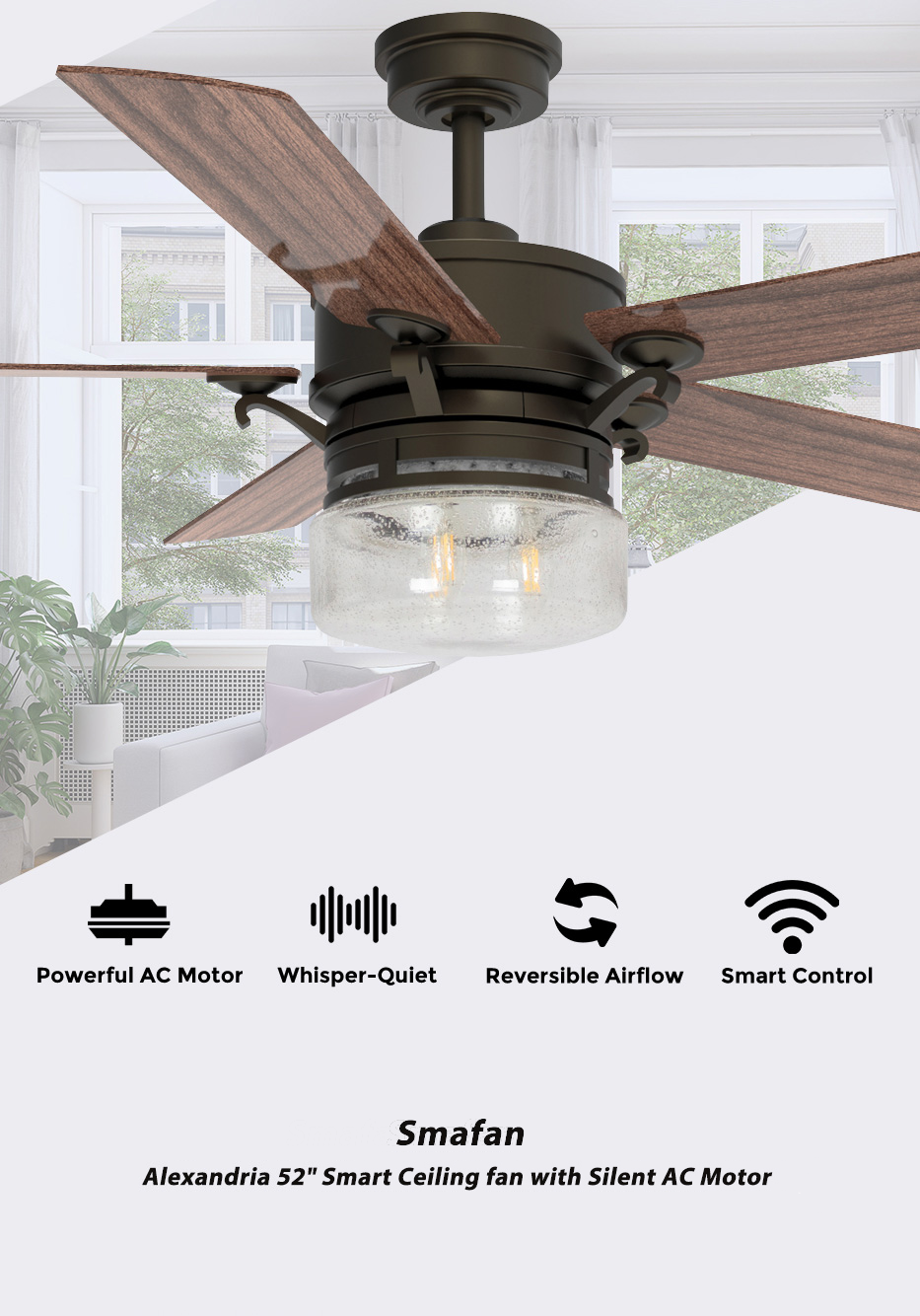 This Alexandria 52'' Smart Ceiling Fan with 5 blades keeps your space cool, bright, and stylish. It is a soft modern masterpiece perfect for your large indoor or outdoor covered spaces. This modern WiFi smart ceiling fan is a simplicity designing with Oil Rubbed Bronze finish, use elegant Plywood blades with Ultraviolet material and compatible with LED Bulb(Not included). This Alexa compatible ceiling fan features wall control, Wi-Fi apps, wireless Bluetooth, Siri Shortcut and Voice command technology (compatible with Amazon Alexa and Google Home Assistant ) to set fan preferences.