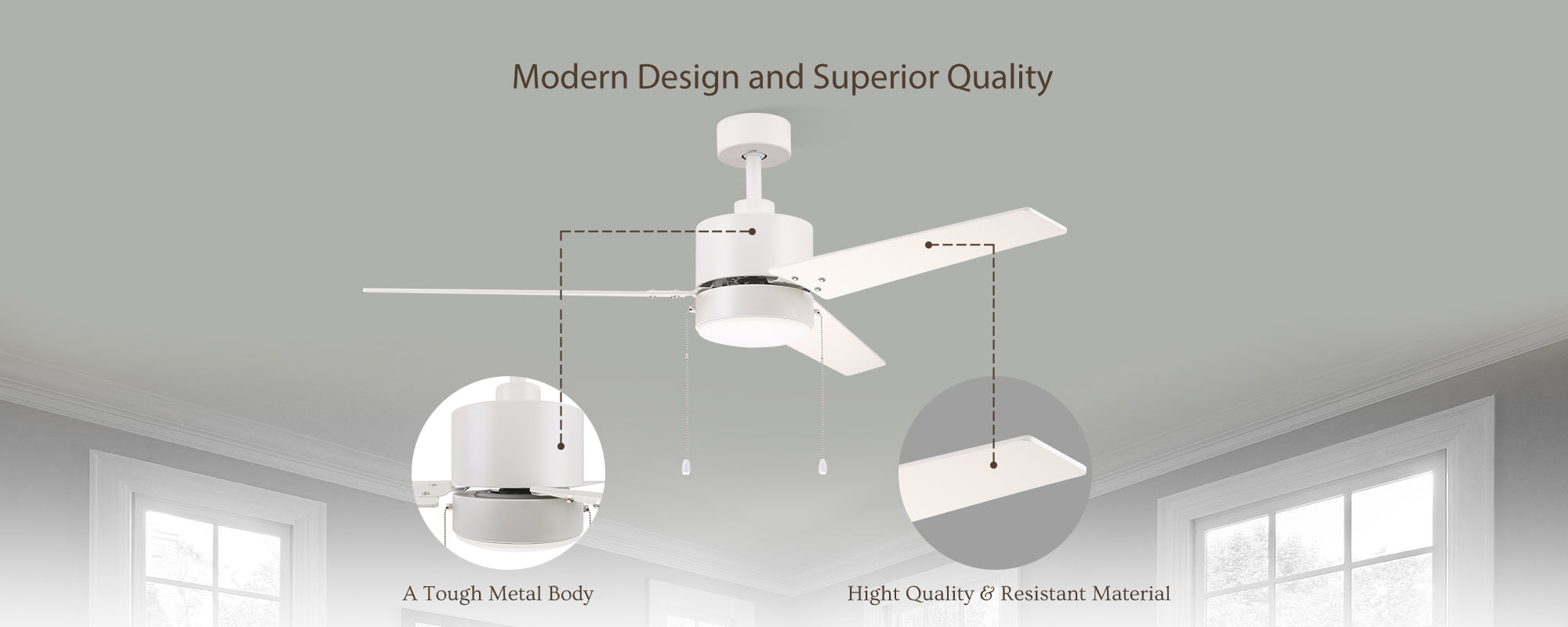 - SUPERIOR MATERIALS: Designed to resist long-term use, this modern ceiling fan is built using premium plywood, fortified metal, and a protective light cover.