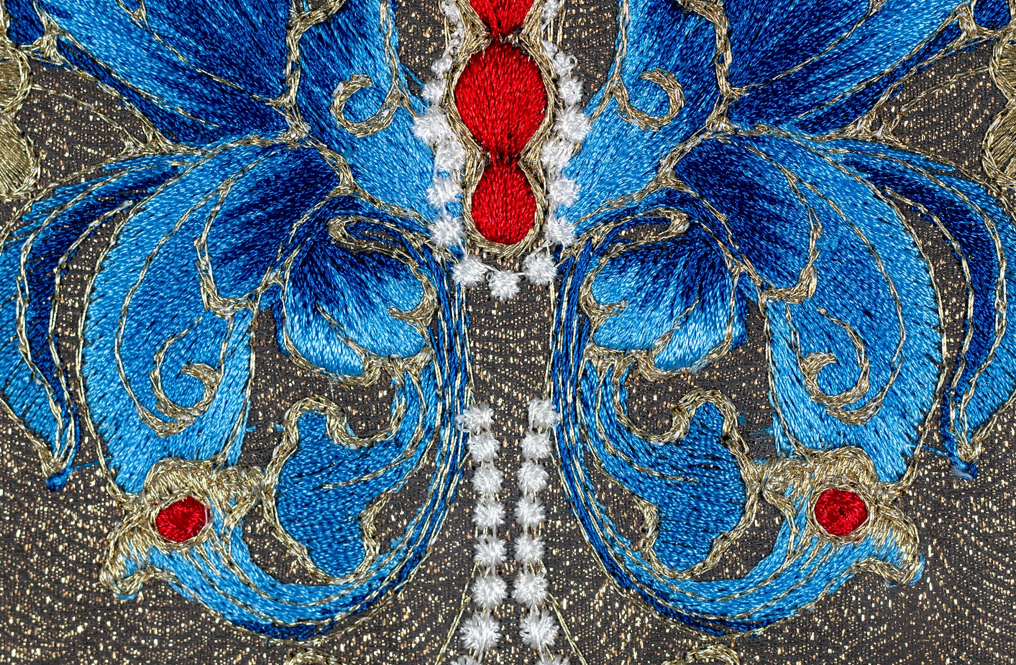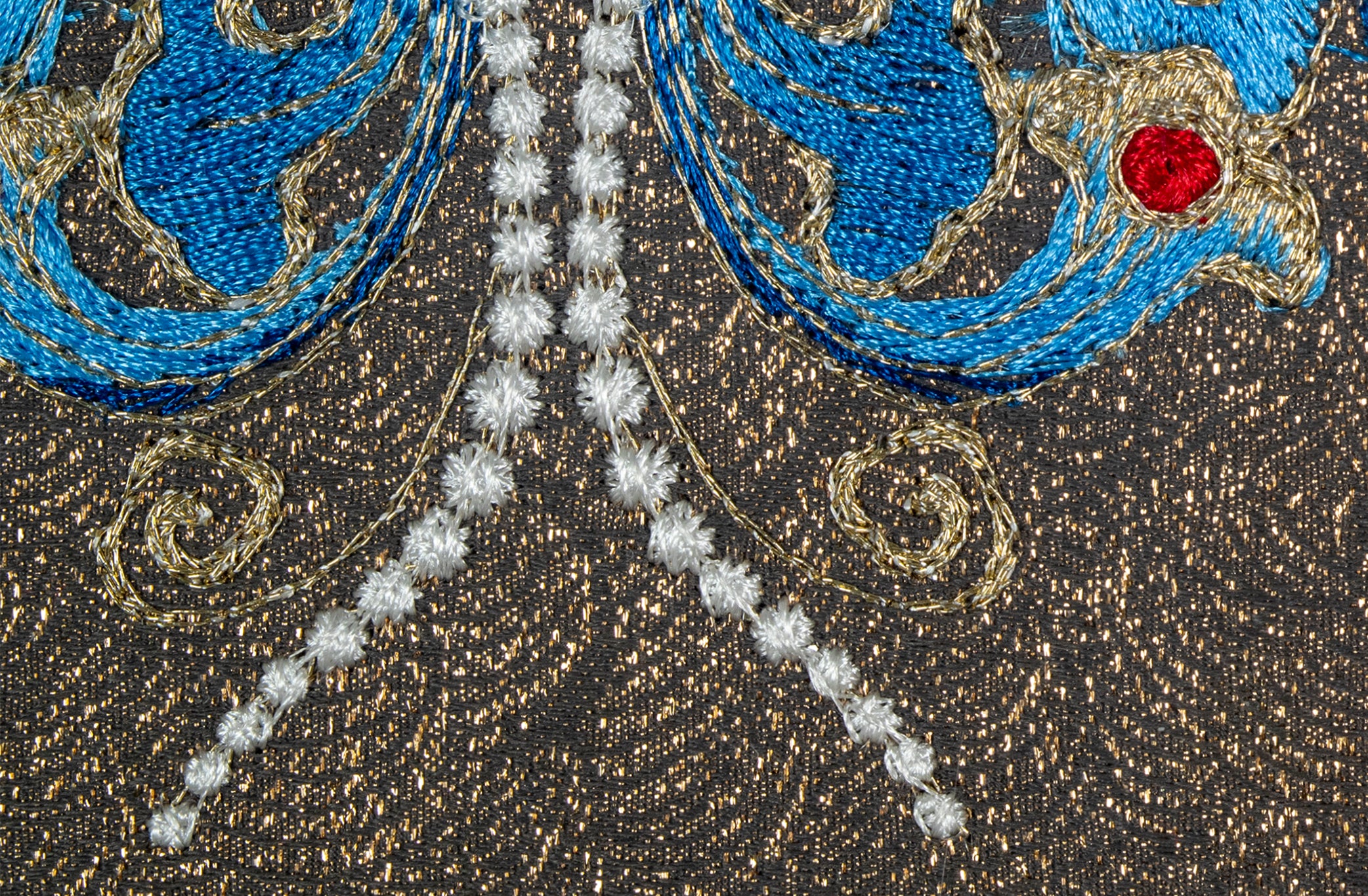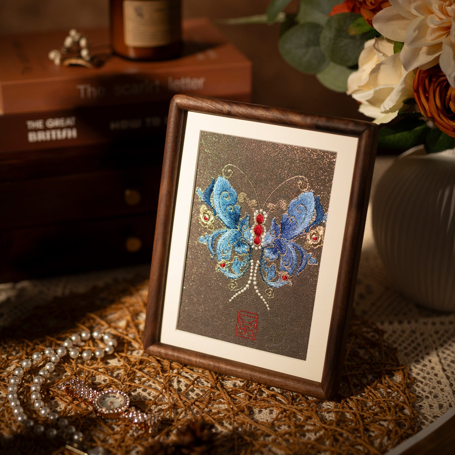 This piece of framed embroidered silk textile combines hand embroidery and mechanical textile embroidery, inspired by the beautiful Morpho menelaus, and shows us a lifelike jewel butterfly on a golden fabric with wavy-curved stripe. Use different embroidery techniques - back stitch, knotted stitch and satin stitch. Utilizing back stitch embroidery techniques and golden silk threads, this artwork outlines the butterfly, while the main body and wings are crafted from red silk and two varying shades of blue silk using satin stitch embroidery techniques. Meanwhile, let's focus our eyes on the white spots on this framed textile art resembling pearls. Combining knot embroidery techniques, white silk threads are used to adorn the butterfly's body and cercus, complementing the golden satin stitch floral pattern, presenting a sense of elegance and grandeur for the butterfly. Taking in the entire decor artwork, the choice of gold as the main color for both the background and outlining enhances the butterfly's striking brilliance while also symbolizing the fleeting yet beautiful nature of life. This embroidered artwork is suitable for placement on bedroom dressers, office desks, or in study rooms, serving not only as decorative elements but also as a means to relax and rejuvenate amidst the appreciation of art. It helps individuals better confront the challenges of work and study, welcoming the dawn of new beginnings.