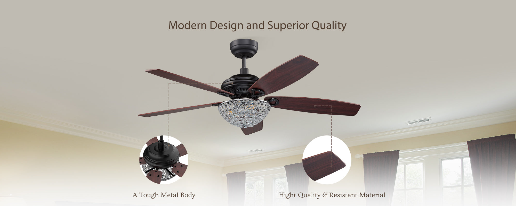 Constructed with meticulously chosen materials for a contemporary appearance and top-tier quality, featuring robust plywood blades, a resilient metal base, and high-grade crystal pendants.
