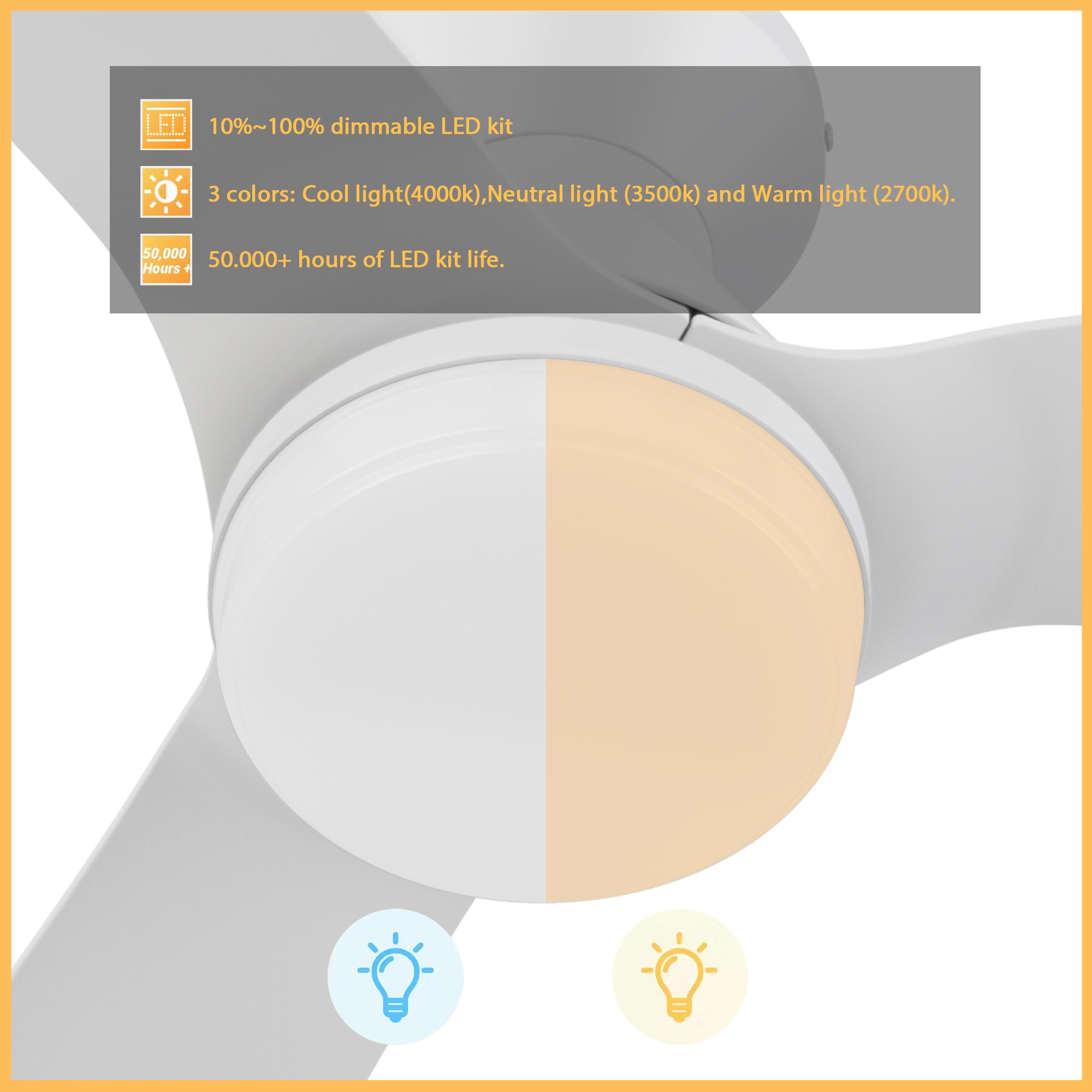 - DIMMABLE LED LIGHTING: With the black and gold ceiling fan's durable and versatile LED light kit; dim the lighting, adjust the light color temperature between warm and cool, and enjoy more than 50,000 hours of energy-efficient use!