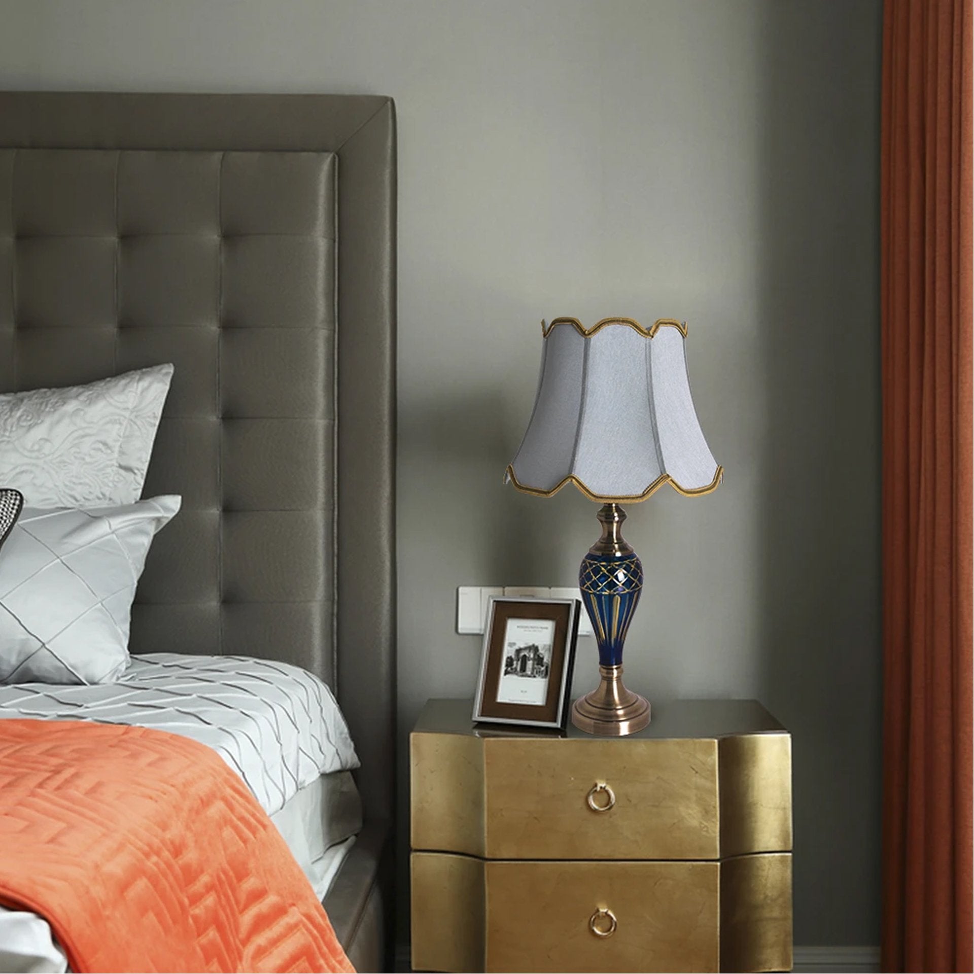 With beautifully chiseled, fluted glass base, this art deco table lamp will add a refined twist on your home lighting. The alluring silhouette of this beveled glass table lamp is set atop on a brushed metal stand. It's topped with a scalloped bell shape shade that provides a natural complement to the glass base.