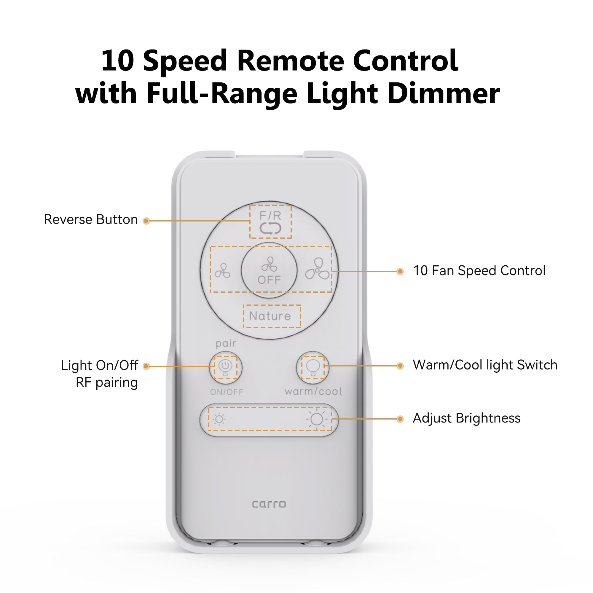 Special Feature | Full function remote control - fan speed, light on/off/dim, reverse function 10-Speed reversible whisper quiet DC motor Integrated dimmable 4000k LED light kit, Quick & Easy Install |