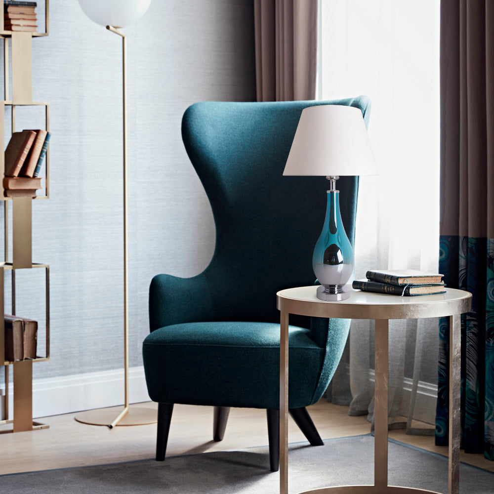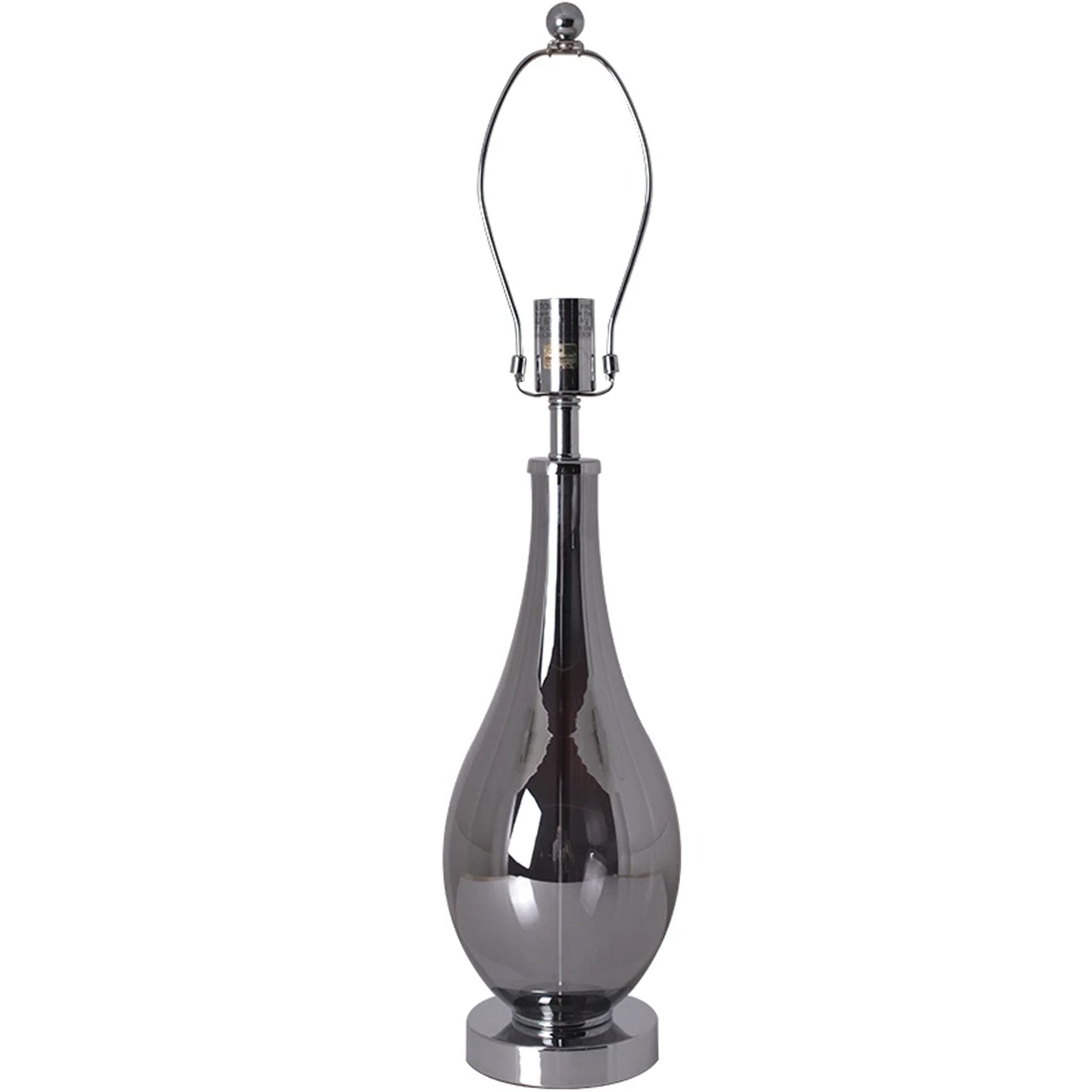 Get contemporary with this beautiful modern table lamp design. The sleek droplet body is impressive with an two-tone blue ombre finish and fluid lines. The striking translucent droplet glass base looks crisp and clean and contributes to the vertical interest of this updated design. Add a refined twist on your home lighting with Smafan Tulip table lamp collection. Enjoy the alluring style of this gourd silhouette glass table lamp. It's fashioned with a sturdy glass base with a brushed metal stand. It's topped with a drum shape shade wrapped in specialty fabric that provides a natural complement to the glass base.